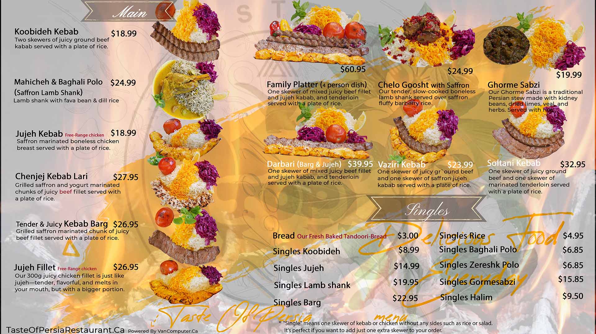 Pick your favorites – Koobideh, Jujeh, Chenjeh, Vaziri, Soltani, Lamb Shank, and more.Choose how to enjoy
