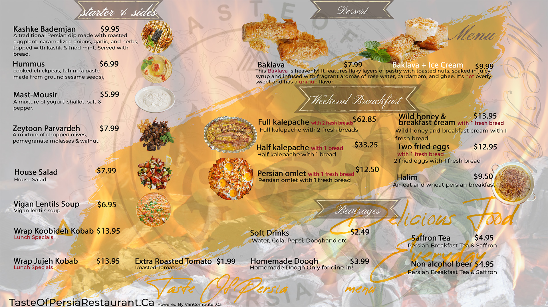 Yes—our menu is fully halal. We also offer vegetarian and vegan-friendly dishes. For example, Kashke Bademjan can be made vegan by omitting the kashk (yogurt).