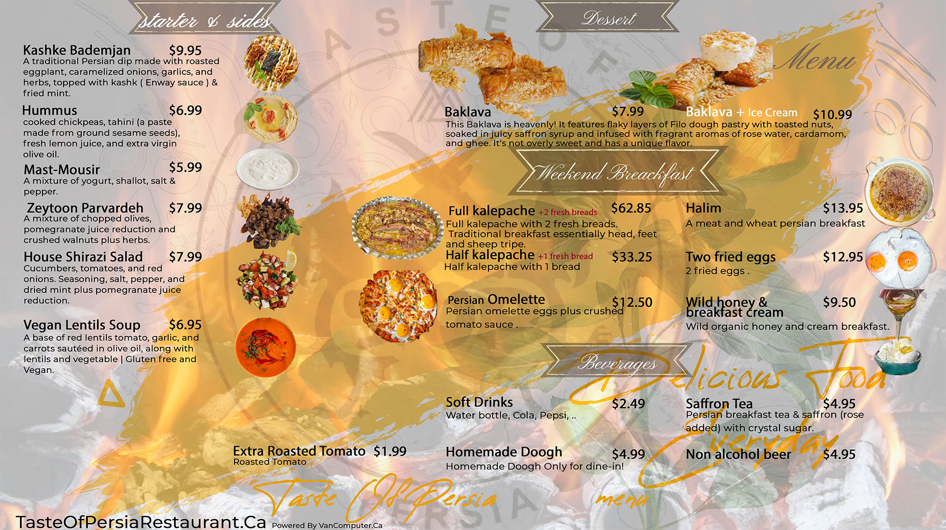 Soup, tea & dates, plus your choice of Koobideh or Joojeh — with a Halim add-on set for groups of 4.
